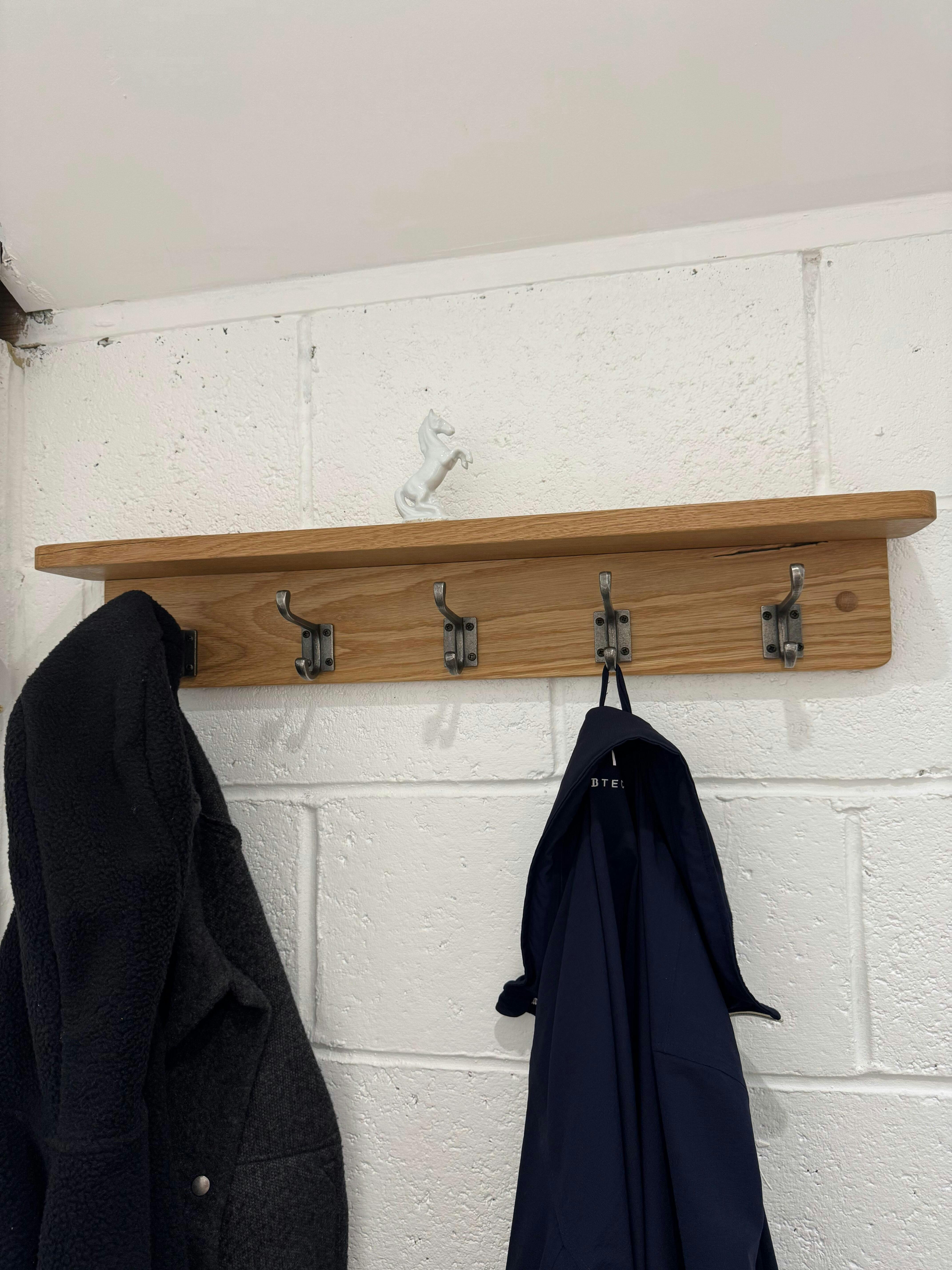 Our classic solid oak coat rack with integrated shelf and cast iron double hooks.