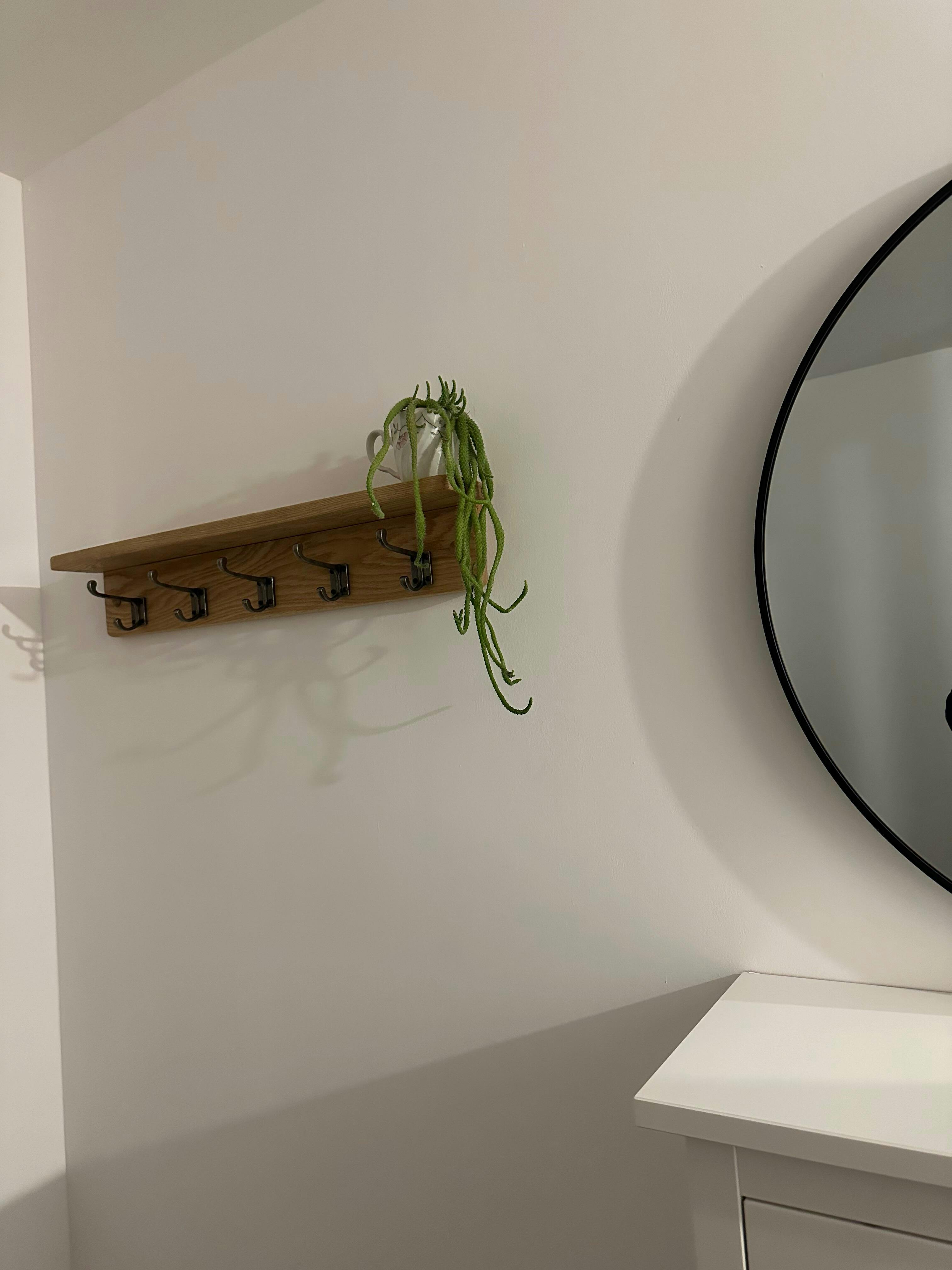 The coat rack with integrated shelf along with a matching shelf for above the radiator has transformed our hallway. Everywhere now looks tidy and stylish. The radiator shelf has given me a place to display Christmas decs so a seasonal bonus too.